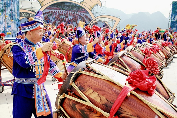 壮族会鼓声响起,气势十足。记者苏昭宇摄
