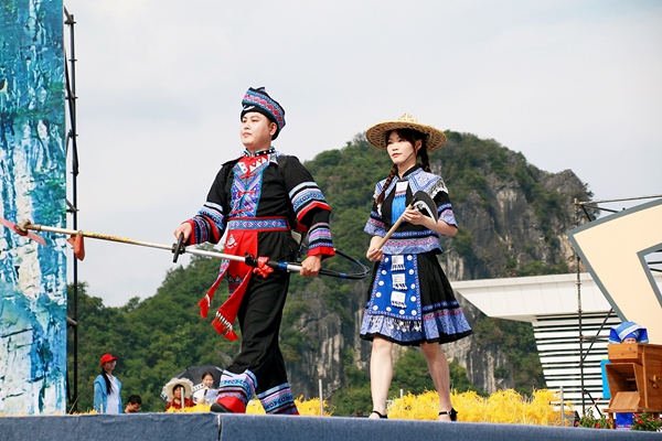 上午10时,群众文艺演出在铿锵的壮族会鼓声中拉开帷幕。古零草凳龙舞、壮族打扁担、壮族三声部民歌等表演轮番登场,演员们身着民族盛装,步伐矫健,鼓点激昂,现场掌声雷动。“我们想让更多人了解马山的文化根脉。”群众文艺演出总导演黄鸿说。马山籍歌手陈道宁则演唱了自创歌曲《瑶家歌唱共产党》。