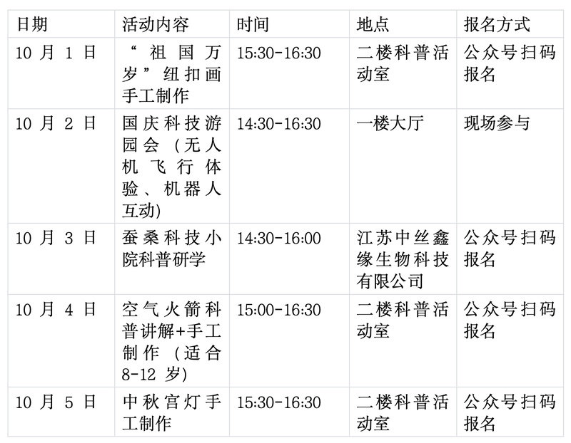 3.特色活动:10月1日—5日《古韵新声,科创未来—国庆非遗五日荟》,每日1小时体验绳结、面塑、南京白局、秦淮花灯等;10月3日—5日“书香育新人”童书展销与主题分享。