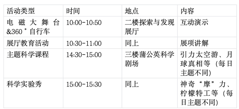 科学实验秀(序厅,14:00开始,免费):10.1/3“能量爆发”、10.2/4“四季科学”、10.5/7“力学世界”、10.6/8“自然之旅”;