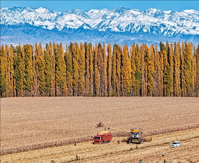 图为10月16日,新疆伊犁哈萨克自治州尼勒克县铁热克特村村民正收获玉米。 |
