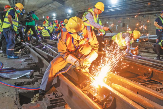 晚10点整,线路正式封闭,110余名施工人员陆续“钻”入地下。地铁隧道内十分狭窄,大型机械无法进场,施工人员只能手持电动扳手、切割工具,分别将30余根轨连线、4组转辙机、20余根道岔轨件、160套扣件成功拆除,并将旧道岔搬出。现场设备轰鸣、火花四溅,场面震撼。