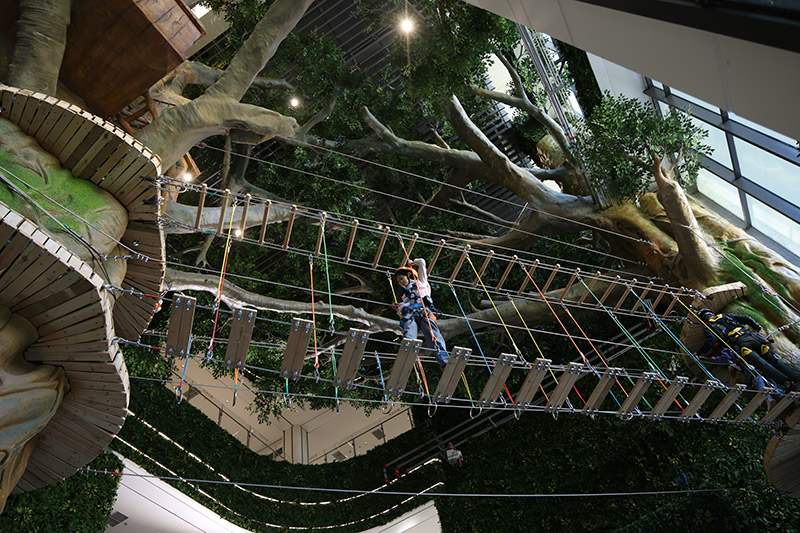 在业态布局中,探险公园配备12米攀冰墙、24米山体飞拉达、18米悬空悬浮岛等高端室内探险设施,结合科学设计保障体验安全;多功能运动空间内10米高空篮球场,以创新结构构建“体教融合”科技场景。