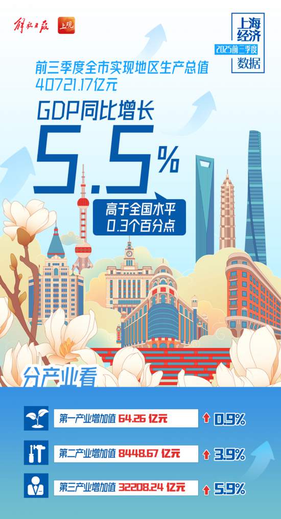10月22日,上海发布前三季度经济数据。根据地区生产总值统一核算结果,前三季度上海市实现地区生产总值40721.17亿元,按不变价格计算,同比增长5.5%,高于全国水平0.3个百分点。