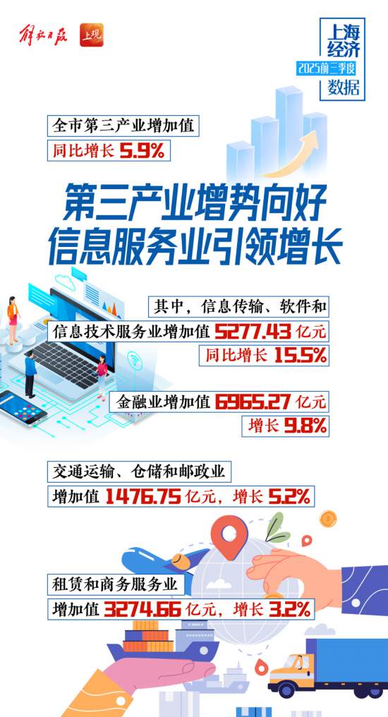 前三季度,上海市第三产业增加值同比增长5.9%。其中,信息传输、软件和信息技术服务业增加值5277.43亿元,同比增长15.5%;金融业增加值6965.27亿元,增长9.8%;交通运输、仓储和邮政业增加值1476.75亿元,增长5.2%;租赁和商务服务业增加值3274.66亿元,增长3.2%。