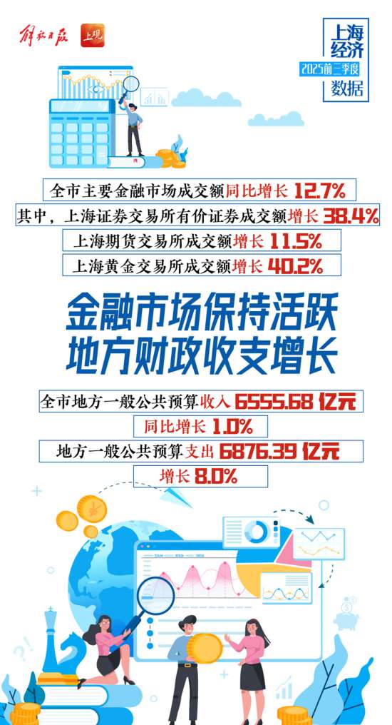 前三季度,上海市主要金融市场成交额同比增长12.7%;上海市地方一般公共预算收入6555.68亿元,同比增长1.0%;地方一般公共预算支出6876.39亿元,增长8.0%。