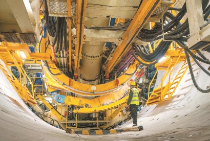 图为工作人员正在操作盾构管片拼装机进行管片拼装。