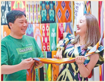 在新疆和田市吉亚丽人艾德莱斯绸店里,工作人员(右)向游客展示艾德莱斯绸。 |