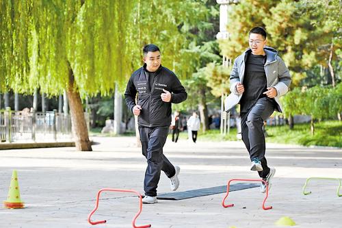 10月24日下午2时,孙文带着障碍桶、弹力带、哑铃等训练器材,又一次来到石家庄荣盛华府小区。过去的一个多月,他都带着这身“行头”,帮助家住这里的初二学生王梓桐进行体能训练。