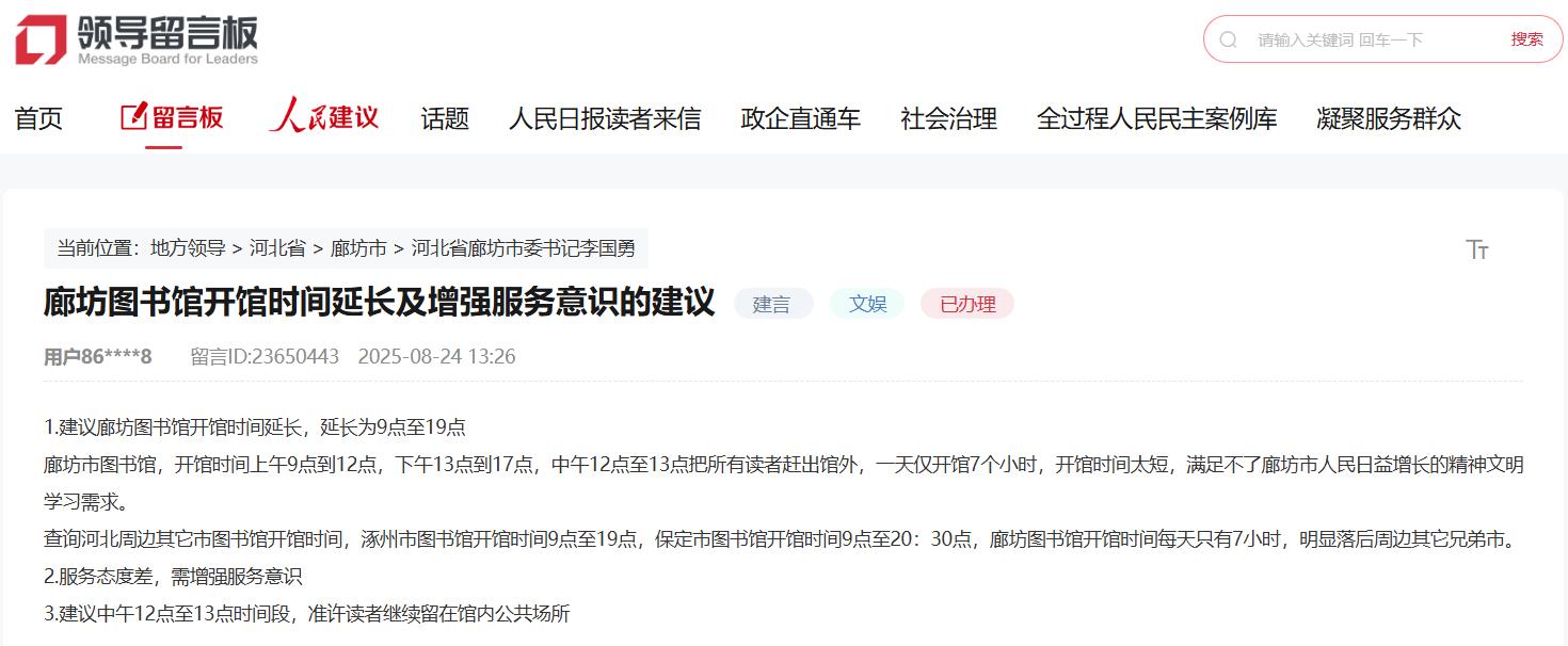 日前,河北廊坊网民韩先生在人民网“领导留言板”留言,建议廊坊图书馆延长开馆时间并增强服务意识。