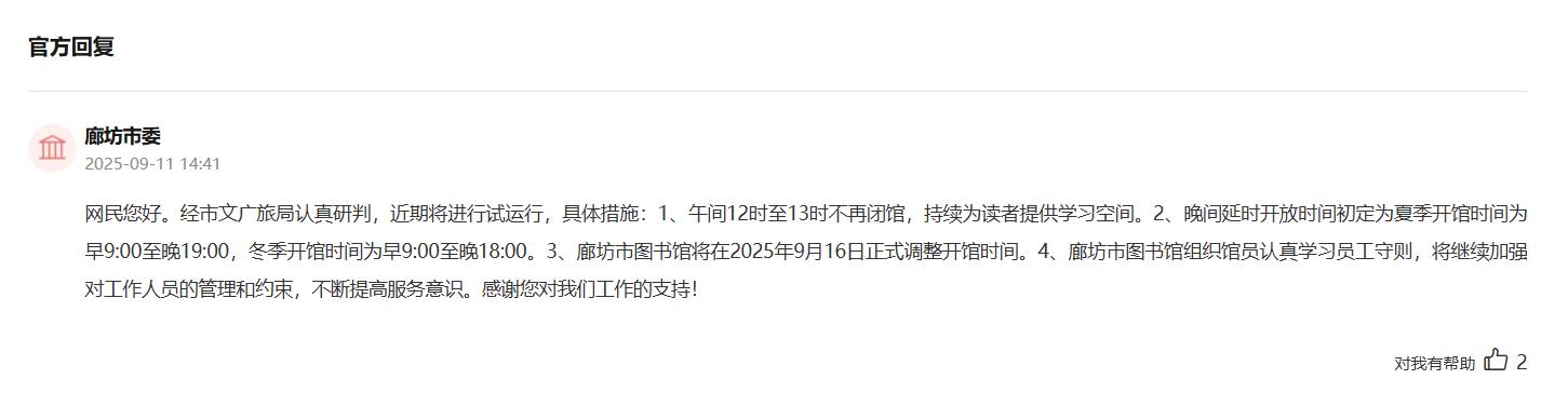 廊坊市委表示,经市文广旅局认真研判,近期将进行试运行,具体措施:1、午间12时至13时不再闭馆,持续为读者提供学习空间。2、晚间延时开放时间初定为夏季开馆时间为9时至19时,冬季开馆时间为9时至18时。3、廊坊市图书馆将在2025年9月16日正式调整开馆时间。4、廊坊市图书馆组织馆员认真学习员工守则,将继续加强对工作人员的管理和约束,不断提高服务意识。