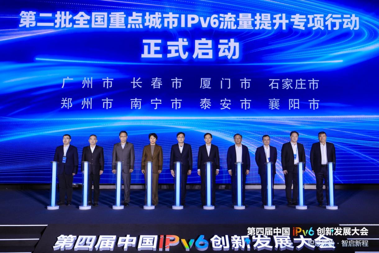 成果发布环节,与会各方共同见证了中央网信办、工业和信息化部组织开展“全国重点城市IPv6流量提升专项行动”的经验和成果,8个重点城市固定网络IPv6流量占比同比增长63.14%,移动网络IPv6流量平均占比同比增长12.37%。中央网信办信息化发展局、工业和信息化部信息通信发展司及第二批8个重点城市相关领导,共同启动“第二批全国重点城市IPv6流量提升专项行动”,深化关键环节升级改造,带动全国IPv6发展水平再上新台阶。会上还发布了工业和信息化部、中央网信办组织开展“网络去NAT”专项工作的阶段性成果:9个试点地区基础电信企业自有环境固定宽带用户IPv6连通率达97.52%,试点地区NAT44设备容量全面实现零增长。后续,相关部门将在试点经验基础上,在全国范围内进一步开展“网络去NAT”专项工作,持续推动网络和应用的IPv6演进升级。