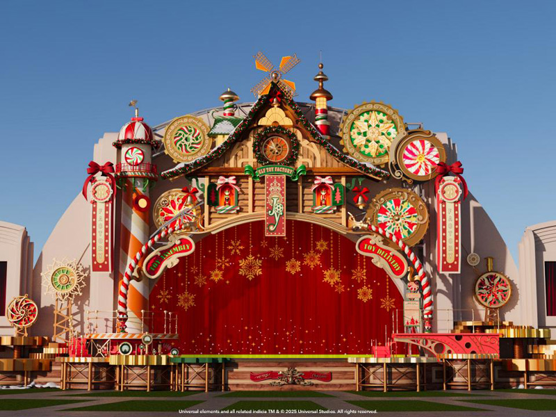 随着冬季假日的大幕缓缓拉开,好莱坞剧场的全新奇幻舞台以高耸的风车、糖果风的齿轮、闪烁的灯饰等元素,营造出一个活灵活现的精灵玩具工厂,金色的机械装置与红绿相间的冬日装饰彼此呼应,搭配雪顶木屋、礼物、花条与彩灯。众多备受喜爱的IP明星角色与数十位歌手和舞者将换上充满节日气息的全新冬季主题服饰,和台下的观众一同探寻有关冬季假日的真谛。