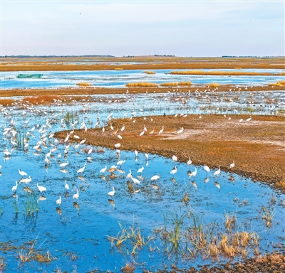 二龙涛河浅水湿地吸引了大量白鹤停歇觅食。 |