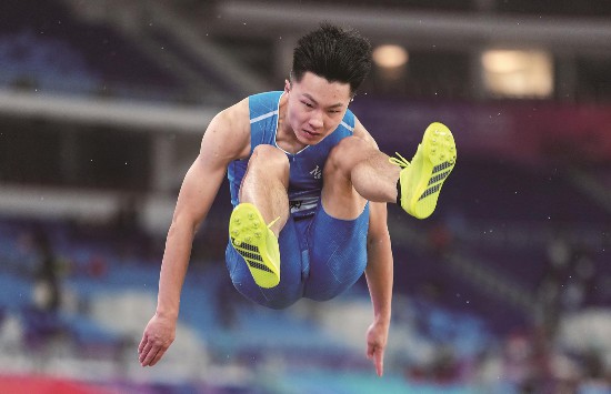 11月18日,在第十五届全运会男子跳远决赛中,吉林省运动员舒衡以8.17米的成绩,力压各路强手,勇夺金牌。图为舒衡在比赛中。(记者张政 张宽 姚思琦 摄)