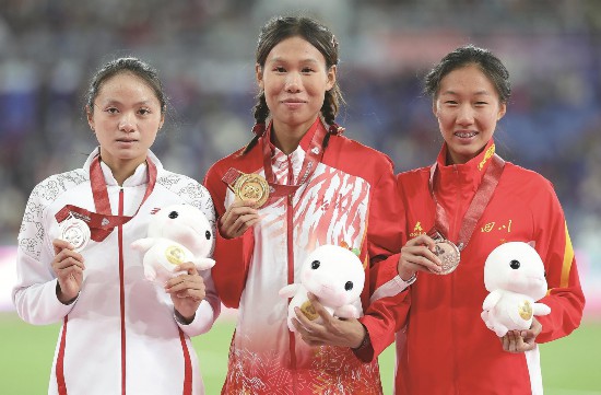 11月20日,在第十五届全运会田径女子1500米决赛中,吉林名将李春辉以4分06秒28的佳绩夺得金牌。图为李春辉(中)在领奖台上。(记者张政 张宽 姚思琦 摄)