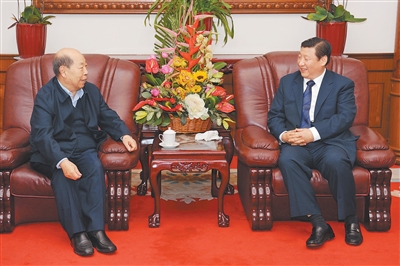 二〇〇八年十二月二日,习近平同志在广东松园宾馆看望王丙乾同志。 |