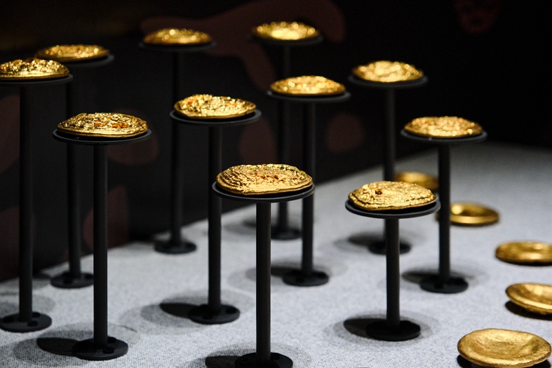 除此之外,展览第二部分的“金锡之贡”单元格外亮眼。展出的黄金器物涵盖褭蹏金(马蹄金)、麟趾金、金饼等完整品类,纯度高达99%。底部刻有“上”“中”“下”铭文的马蹄金与麟趾金,以精湛花丝镶嵌工艺铸就,既是汉武帝时期的祥瑞纪念币,更暗藏着森严的等级秩序。这些黄金不仅见证了海昏侯刘贺“身历王帝民侯”的传奇人生,其来源涵盖帝王赏赐与封地积累,更直观反映了西汉“黄金时代”的强大国力与厚葬观念。