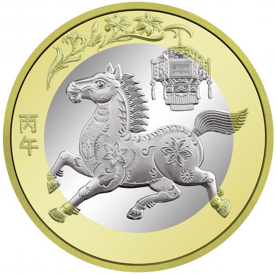 双色铜合金纪念币背面图案为中国传统剪纸艺术与装饰年画元素相结合的马形象,衬以花灯和萱草图案,币面左侧刊“丙午”字样。