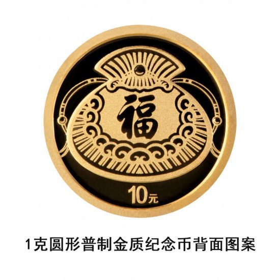 1克圆形金质纪念币背面图案为“福”字、荷包组合设计,并刊面额。