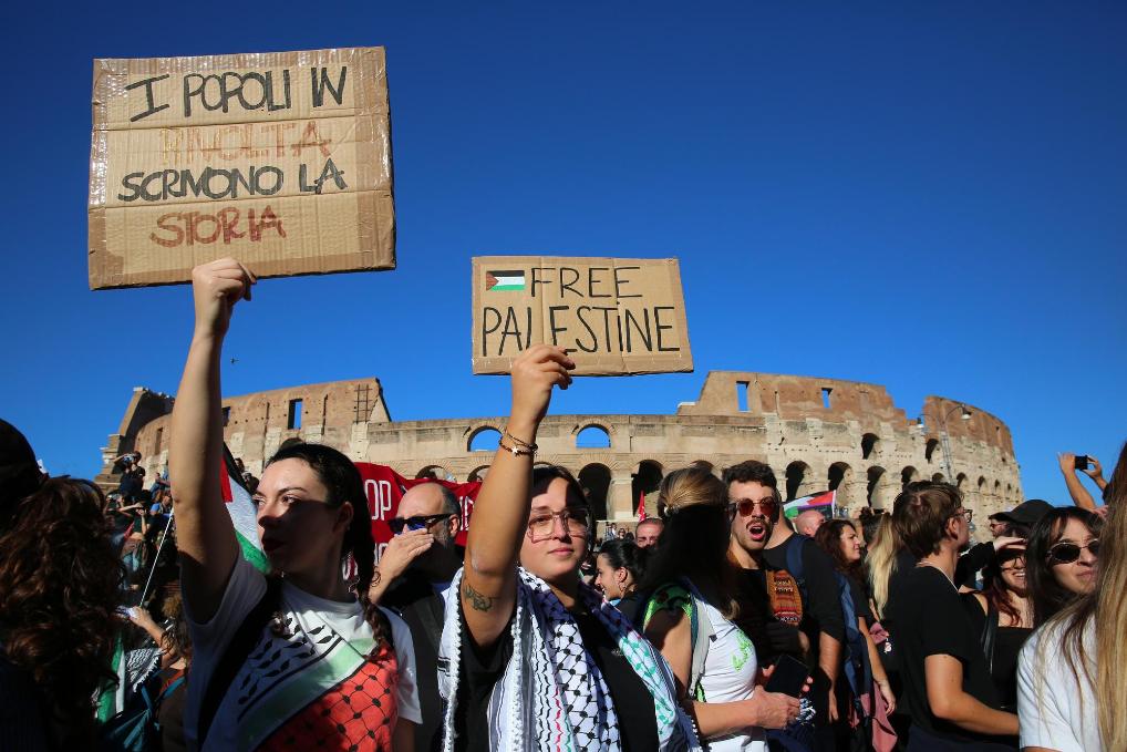 10月4日,在意大利罗马,游行队伍向斗兽场行进。连日来,意大利多地爆发大规模抗议活动,罗马、米兰等地数万人走上街头,声援巴勒斯坦。新华社记者李京摄