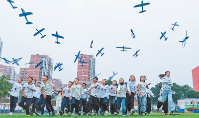 江苏省宿迁市泗洪县新星城西学校,学生们在放飞飞机模型。 |