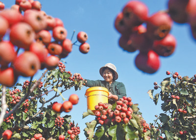 山东省淄博市沂源县悦庄镇崔家庄村,农民在采摘山楂。 |