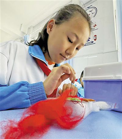 考虑到学生年龄差异,课程采用“梯度进阶”设计。低年级课堂以简单的“戳戳乐”为主,学生学习制作水果、小动物等平面造型,在反复练习“铺毛”“戳实”中掌握基础技巧;中高年级则挑战立体造型与主题创作,学生们发挥想象,有的复刻草原奔马、牛羊,有的结合航天知识设计“火箭与星球”,还有的以“民族团结”为主题,制作象征各民族同心的作品,让传统技艺与时代元素碰撞出火花。