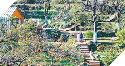 湖北黄冈市罗田县三里畈镇錾字石村甜柿挂满枝头,游客纷纷前来拍照打卡游玩。  |
