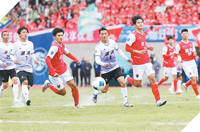 江苏宿迁市泗洪县足球代表队和湖滨新区足球代表队队员在泗洪县体育场角逐。  |