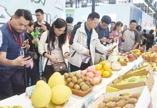 在2025年中国—东盟水果产业发展大会暨广西水果产销对接活动现场,色彩斑斓的广西水果吸引观众拍照。记者刘增璇摄