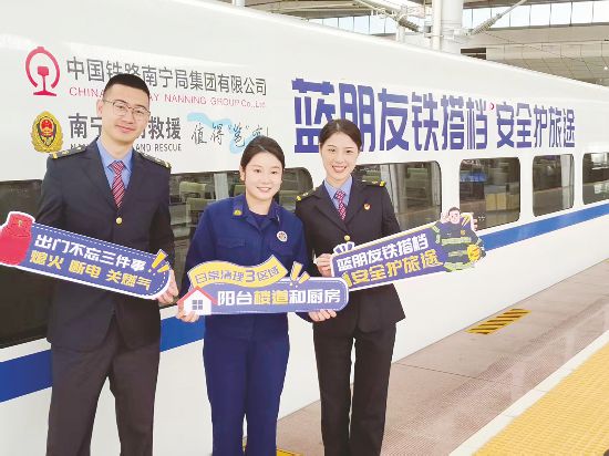 上午9时24分,D3619次消防宣传列车正式发车,从南宁东站开往广州南站。旅途中,南宁市消防救援支队的“蓝朋友”与列车工作人员“铁搭档”一同在车厢内开展消防知识问答活动,并发放消防宣传手册等,与旅客积极互动,还为旅客送上消防文创纪念品,现场气氛活跃。旅客黄女士表示:“在旅途中也能学到实用的消防知识,既新鲜又有意义。”