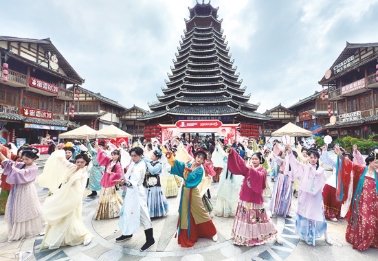 汉服爱好者在相思小镇翩跹起舞。 记者潘浩摄