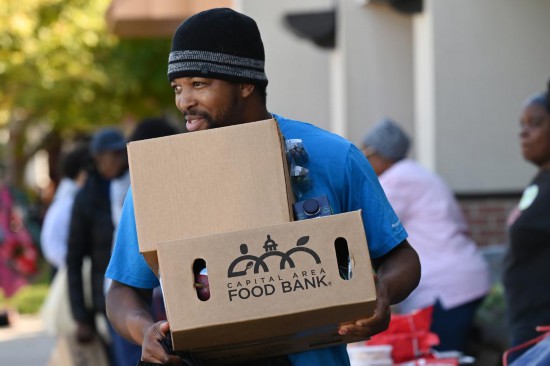 10月21日,在美国马里兰州海厄茨维尔市,一名联邦雇员领取免费食品。 新华社记者李睿摄