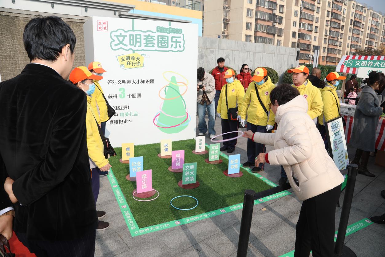 另一处“文明套圈乐”互动区,居民参与知识答题——题目涵盖犬证办理流程、遛犬拴绳规范、犬便清理要求等实用内容,答对即可获得套圈机会。“既学了知识又拿了奖品,这种形式比单纯说教管更生动有效。”现场工作人员介绍,互动环节不仅是为了活跃氛围,更希望通过“玩中学”的方式,让文明养犬规则变成居民的自觉记忆。