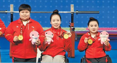 12月3日,河北省运动员郑飞飞(左)、石珊珊(中)、郭玲玲在全国第十二届残运会举重女子团体比赛赛后颁奖仪式上。 本报记者 王伟宏摄