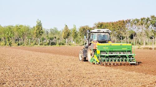 近日,河北高速集团驻东光县任庄村小麦示范基地内,高性能复式条播机播种小麦。