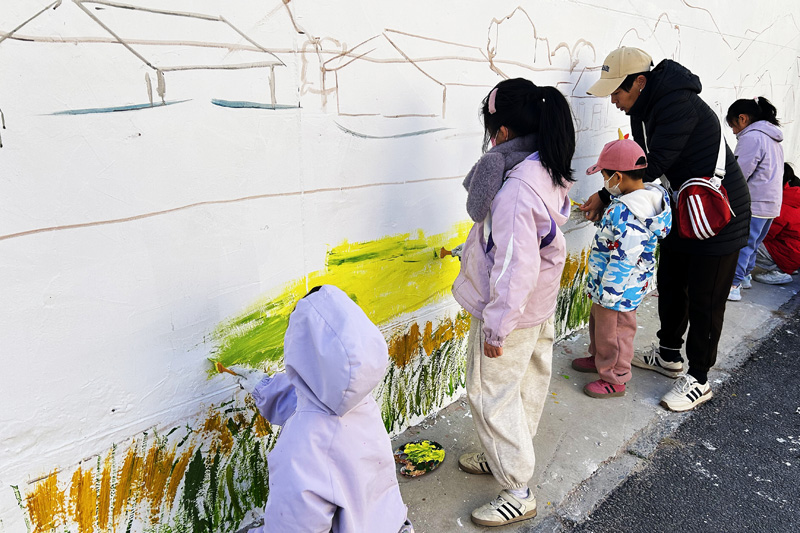 据了解,此次墙绘创作全程秉持丰彩城市艺术季“地区搭台、社会动员、各界参与、艺术共创”的核心理念。 墙绘活动由西庄店村联合绿野仙踪郊野乐园共同发起,由北京市美术家协会会员李绚担任艺术指导,并携手邀请村内孩童参与色彩的绘制。孩子们用稚嫩却真挚的笔触,描绘着记忆中的田野与家园,让这幅作品不再只是以外来视角呈现,更成为村民自我表达的载体。颜料在阳光下渐渐凝固,呈现的不仅是画面,更是代际之间对乡土认同的共同构建。