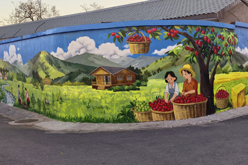 西庄店村墙绘以明亮的色彩描绘出丰收景象,金黄的麦浪与绿意盎然的菜畦交织铺展,孩童奔跑在田埂上的身影生动展示在墙上,以纪实与艺术结合的手法展现村落魅力。从向阳花公社里小社员收麦的场景,到“绿水青山就是金山银山”的生态理念,再到隐观山居的生活画面,层层展示出西庄店村在乡村振兴中,生态保护与人文生活共同发展的鲜活画卷,成为一部可观、可感的乡村发展视觉档案。