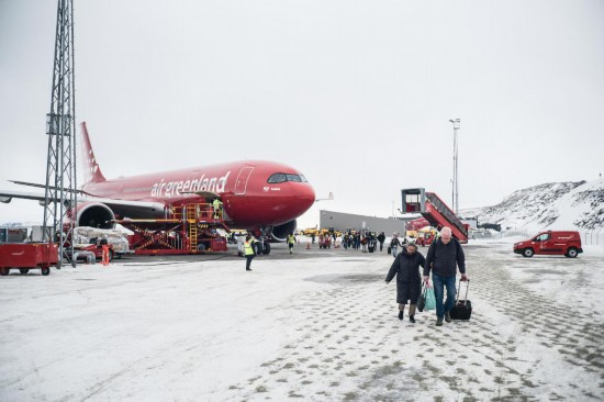 3月18日,在丹麦自治领地格陵兰岛首府努克,一对夫妇相互搀扶走出机场。新华社记者彭子洋摄